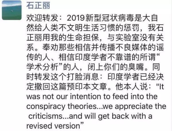 2月2日下午3时左右,中国科学院武汉病毒所研究员石正丽,在自己个人微信朋友圈发文:2019年新型冠状病毒是大自然给人类不文明生活习惯的惩罚,我石正丽用我的生命担保,与实验室没有关系。奉劝那些相信并传播不良媒体的谣传的人,闭上你们的臭嘴。同时转发这个打脸消息:印度学者已经决定撤回这篇预印本文章。
