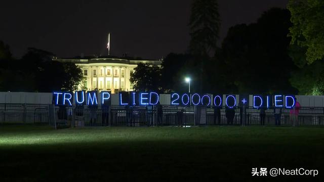 昨天是2020年9月21日,距美国发现首例新冠病人正好8个月整。八个月前的1例变成了今天的700万例,死亡人数超过20万,这是谁之过?答案大家都很清楚。昨天晚上,不少美國民众自发地在白宫前的草坪上摆放了一个白色灯光的LED显示牌,上面写着:Trump Lied, 200,000+ Died. 中文意思为“川普隐瞒(疫情),(新冠)死人二十多万”。