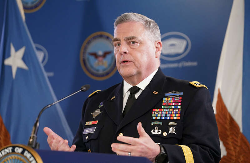 2023年5月25日,美国参谋首长联席会议主席密利与美国国防部长奥斯汀于联合新闻发布会上发表讲话资料照 (路透社)