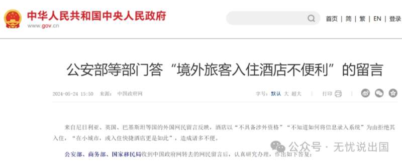 对此,有关部门高度重视!中国公安部、商务部、国家移民局收到中国政府网转去的网民留言后回复称,中国公安部和国家移民局正在积极协同配合商务部、文化和旅游部等行业主管部门研究工作措施,要求旅馆业不得以无涉外资质为由拒绝接待境外人员,指导监督旅馆业进一步改进涉外接待服务能力,提升从业人员服务水平。