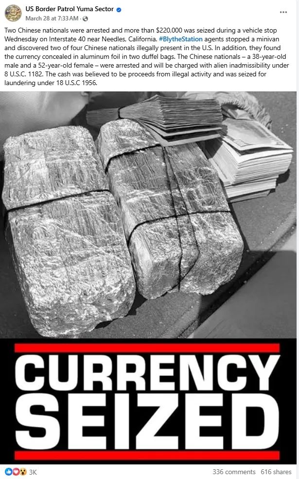 根据介绍,3月26日,边境巡逻特工在加州尼德尔(Needles)拦下一辆小型货车时对其进行了搜查,发现两名中国公民“非法居住在美国”,特工还从货车内缴获了超过22万美元的现金,该机构表示,他们相信这些现金与非法活动有关,指控他们涉嫌洗钱和其他犯罪活动。